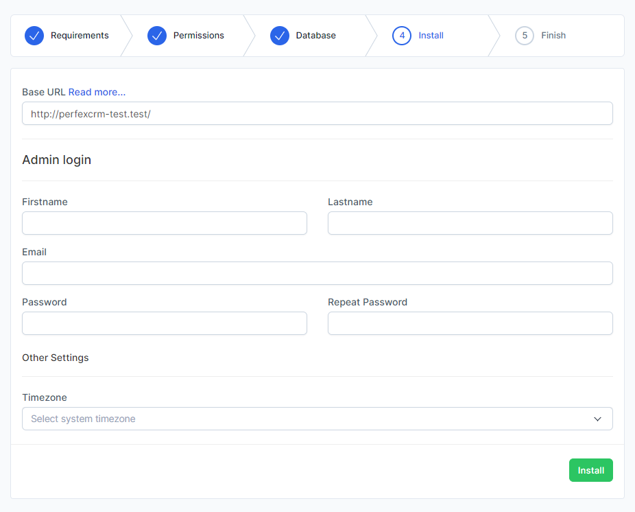 Assume that you uploaded the files to “erp” folder, navigate to eq. http://yourdomain.com/erp/install – Keep in mind that you need to adjust the URL based on where you uploaded the files. If you are installing on subdomain named eq erp you need to access the url like http://erp.yourdomain.com/install.